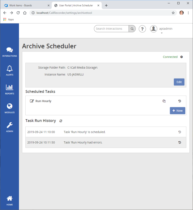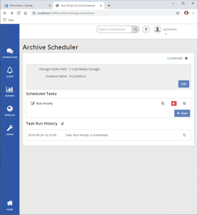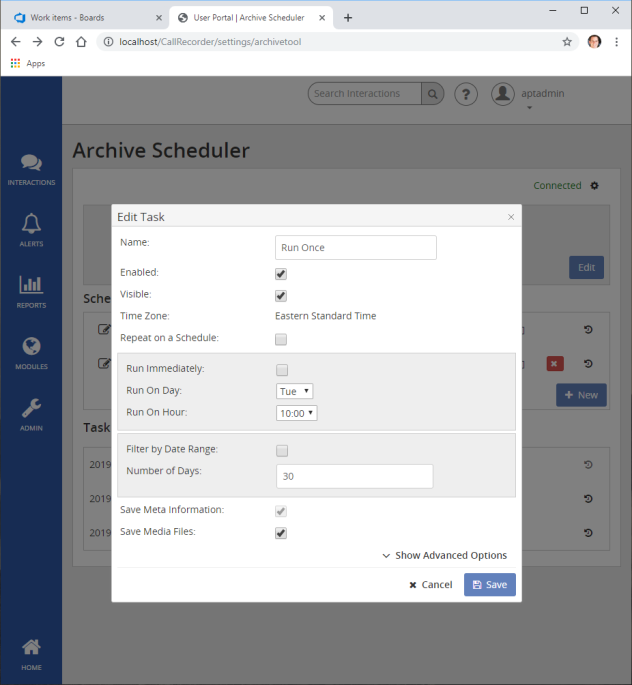 The SmartRecord Archive Scheduler is a tool which downloads recorded media to an archive location. It consists of a Windows Service application running on a User’s Windows workstation, a management interface accessible from the SmartRecord User Portal, and a Server API providing data and media assets to the Service. It downloads and archives media as a one-off or as a repeating scheduled process.