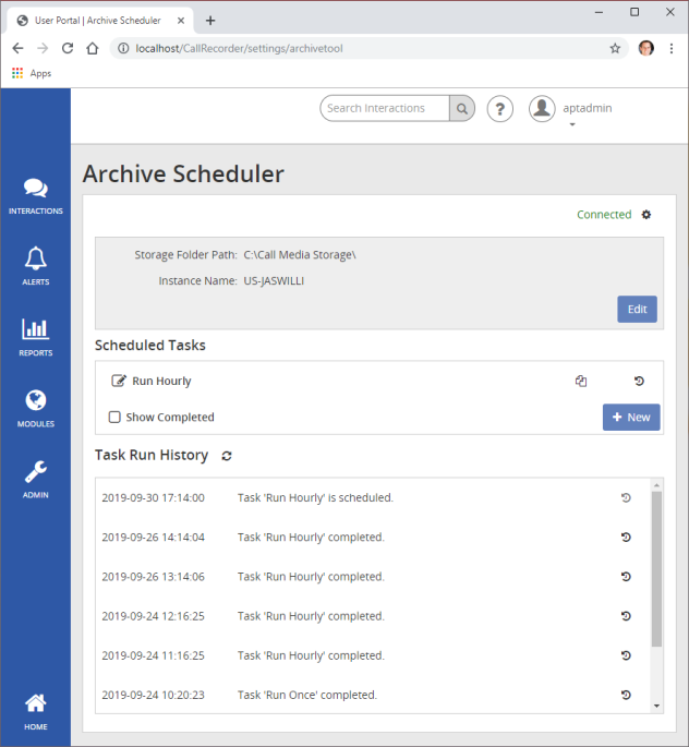 - View the Scheduled Archive Task in the Scheduled Tasks list. Note that a date appears in the Task Run History item indicating when the Task is next scheduled to run.