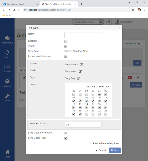 - Create a new Scheduled Archive Task. When a task is set to “Repeat on a Schedule”, the Scheduled Task will run on each prescribed Hour, Day, Week, and Month. “Number of Days” indicates how far back the Task will search for un-archived media. If a Task runs Hourly, it should only download media for the past hour. However, the Task will check the last x days (30 days in my example) for media which may have been missed by previous downloads.